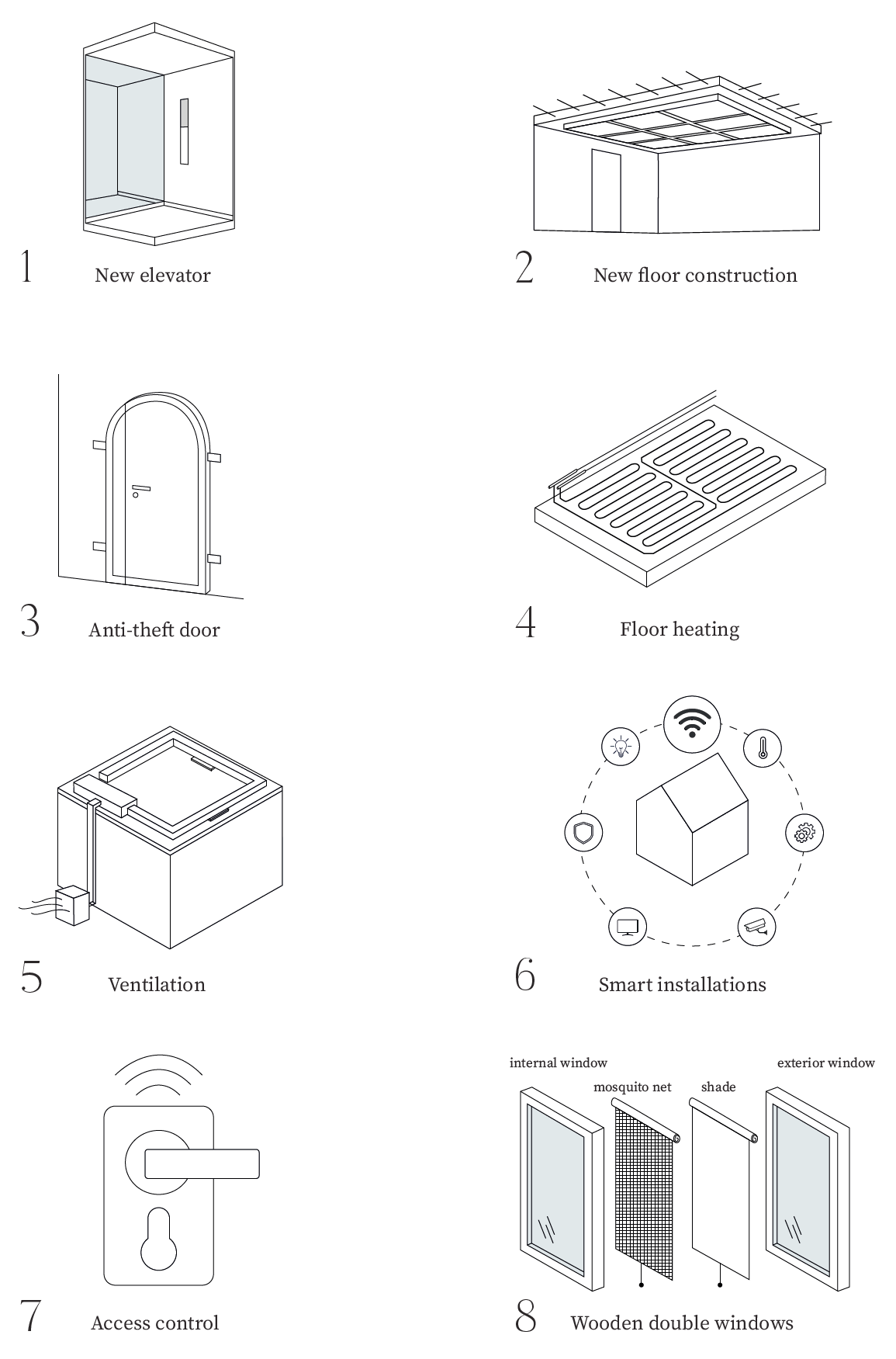 The integrated forced ventilation system will incorporate local recovery units. A split system with an inverter outdoor unit and indoor units in key rooms will be installed to facilitate cooling and additional heating of the apartments.